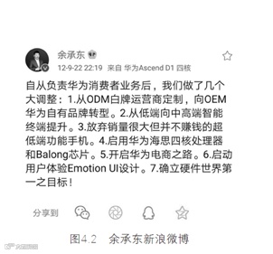 余承东到终端之后,每次在向公司汇报商业策略、战略方向后,他会把政策、战略、方向和员工讲,甚至在新浪微博上提到确立硬件世界第一的目标。