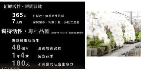 老板花了很大投入,让这种一年只开一次的兰花,变成一年四季都开花,所以宣传的很多内容都跟花有关。