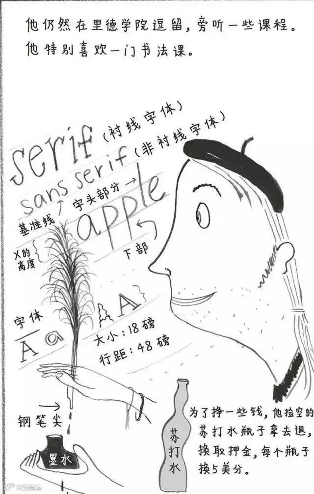 ▼ 他特别喜欢一门书法课。最初的Mac电脑漂亮的字体便出自他在书法课上的设计