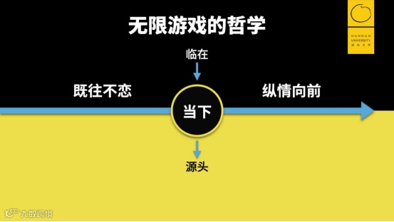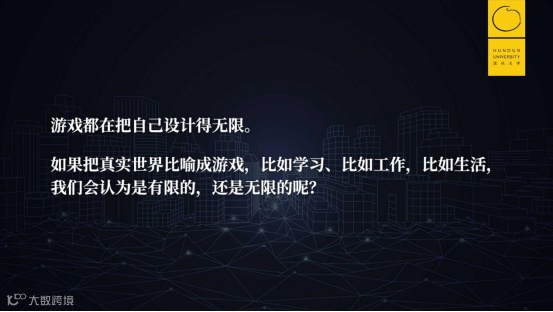 这就引出了我们的问题。游戏都会尽量设计得无限,来模拟我们的人生;那么反过来,如果我们把真实的生活比喻成游戏,有的时候反倒会陷入一个误区,认为人生是一个有限的东西。比如我们的学习、工作、生活,很多人可能会误认为是有限的,而不是无限的。这其实是我今天想说的一个脉络。