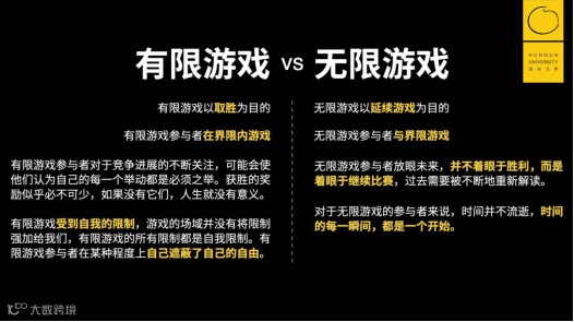 有限游戏是以取胜为目的,参与游戏的玩家都是为了赢。但无限游戏不是这样,它是以延续游戏为目的,也就是参与游戏的每一个玩家都要不断地把游戏进行下去。所以有限游戏一旦有人赢了、输了,这游戏就结束了;而无限游戏是一直进行下去的。