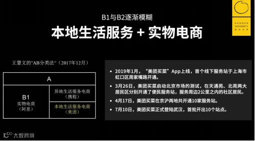 它把美团联合创始人王慧文曾经提出的AB分类法打破了,B1和B2的界限模糊掉了。AB分类在当时是有效的,进入一个市场的时候必须给自己合理的定位,和市场主流玩家做一个区隔,进行错位竞争。但随着业务不断地发展,你可能需要突破自己的边界,否则就是一个限制,把自己放在里面了。