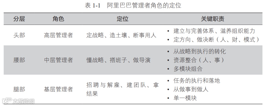 在《刷新管理》一书中,许林芳从阿里巴巴把管理者分为头部、腰部和腿部3层来讲解数字化时代管理者的定位,每层管理者的角色定位是不一样的(见表1-1)。这样的定位非常形象,适用于很多企业。