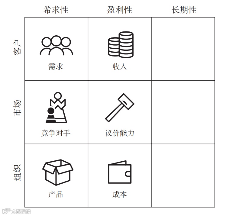 现在有趣的事情发生了。我们明确了三个目标:希求性、盈利性和长期性。我们还明确了三个不断变化的主体:客户、市场和组织。由于商业领域的一切都彼此联系,每一个主体都会影响每一个目标:比如,竞争中的改变会影响盈利,客户的改变会让产品的吸引力降低。