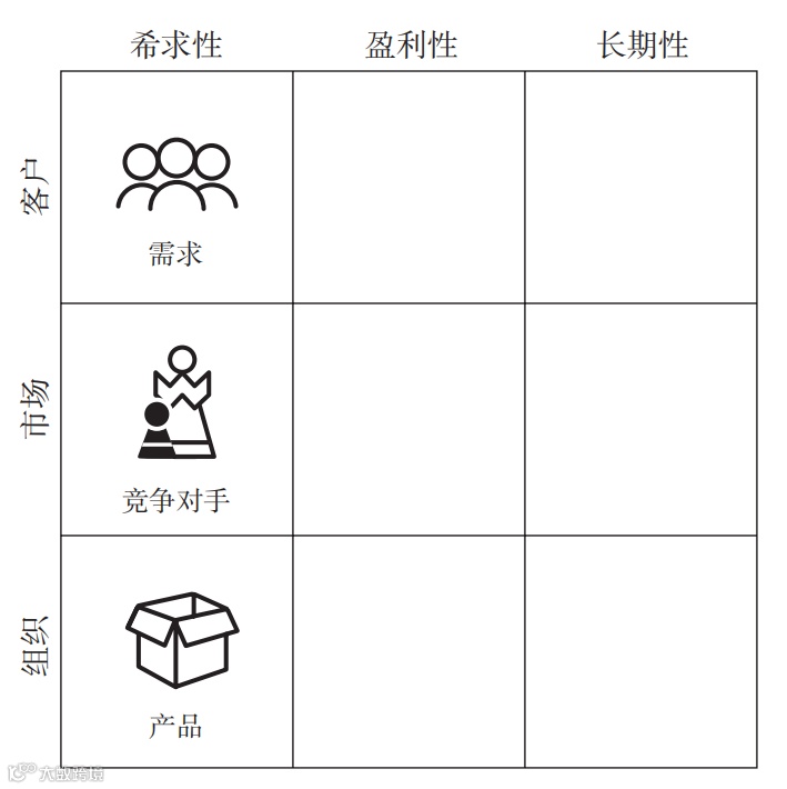 为了为了说明这一点,我们来画一张表格,每一列代表一个目标—希求性、盈利性和长期性,每一行代表一种变化—客户、市场和组织。因此我们有了一张有着 9 个方框的网格,每一个方框都包含着一种可能影响成功的因素,而当我们把这些因素综合在一起考虑时,会出现一个企业的全盘视图。这 9 个方框共同决定了每一种企业的兴衰存亡。