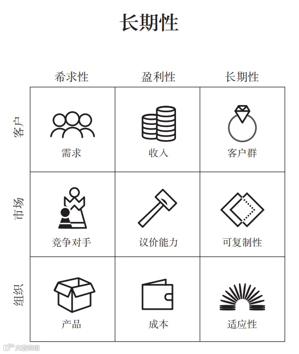 一样事物越容易被复制,长期来看,竞争就越激烈,收益也越小。可复制性在决定企业长期性方面起着关键作用。最后,企业的适应能力直接决定其能否长期生存。最终都会有一个巨大(通常是毫无预期的)的改变会落在每一家企业的门口—想一下数字下载对音乐产业的改变,或搜索发动机对黄页的改变。