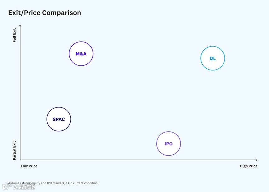 这些分析会随着市场的变化而变化,这个讨论矩阵是基于当前我们所看到的强劲的股票市场进行的。在一个较为疲软的科技公司IPO市场下,我们预计通过IPO / 直接上市的价格与并购退出的价格趋同。评估哪种退出方式对你的公司是最好的需要根据股票市场的情况而改变。