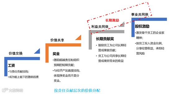 因此归结起来,合理分配价值真正的导向只有一个,就是价值分配以后,各价值创造主体都能保持冲锋的队形,努力实现下一轮更大的价值创造。所有的激励设计必须围绕在这一点来进行,员工的责任贡献是有层次的,所以分配方案要区分层次,同时匹配相应的激励手段。如下图: