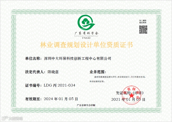 2020年9月,深圳中大环保申请了广东省林学会的“林业调查规划设计”资质,经市林学会和省林学会专业委员会初审、专家评审及公示等环节,于2021年1月5日申请认定通过。