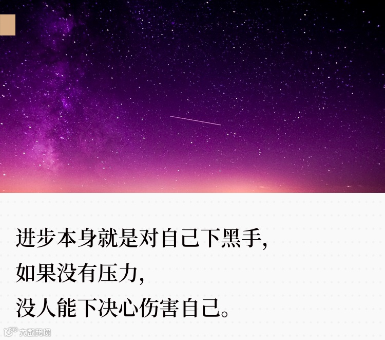 最后再说一点,进步本身就是对自己下黑手,如果没有压力,没人能下决心伤害自己。个人也一样,感受到危机,感受到差距,才会积极地进行自我改造,改掉各种奇怪的毛病,戒掉自怨自艾。
