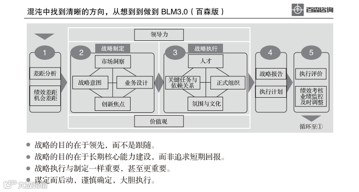 这种战略耐力,需要一套科学管理体系的保证。2009年华为从IBM引入的BLM(业务领先模型),就是一套从规划到执行落地的优秀管理体系。我在过去辅导企业进行战略规划的工作中,又结合中大型企业的实际需求,逐步完善了这一体系,如下图所示。