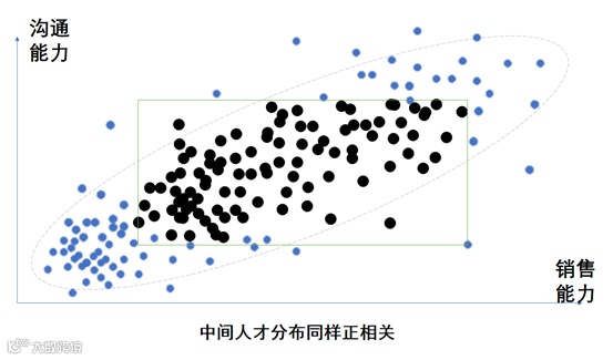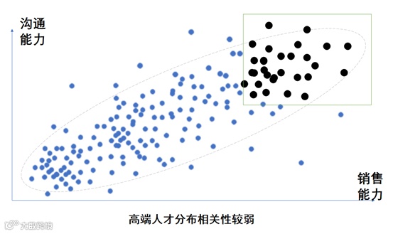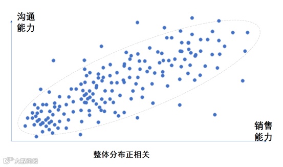 首先,我们必须承认,大部分行业中,沟通能力与销售人员的业绩一定是呈统计上的正向关系的。如果我们对所有人进行一个沟通能力与销售能力的统计,结果应该呈现下面的分布: