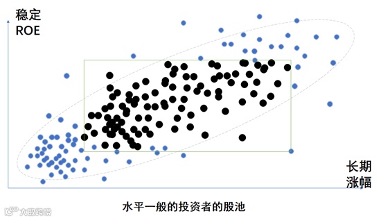 这样选出来的股池必然分布于右上角,本来相关性就弱,再叠加ROE偏好,剔除一些ROE不高的公司,并补入ROE不错,但其他方面弱一点的公司,最后的股池,往往是ROE与长期涨幅变成负相关。