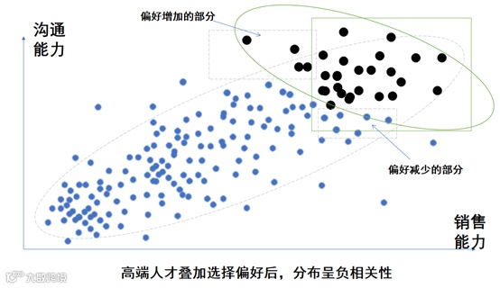 那为什么又变成负相关性了呢?这就跟招聘部门僵化地执行“沟通能力优先”的要求有关。