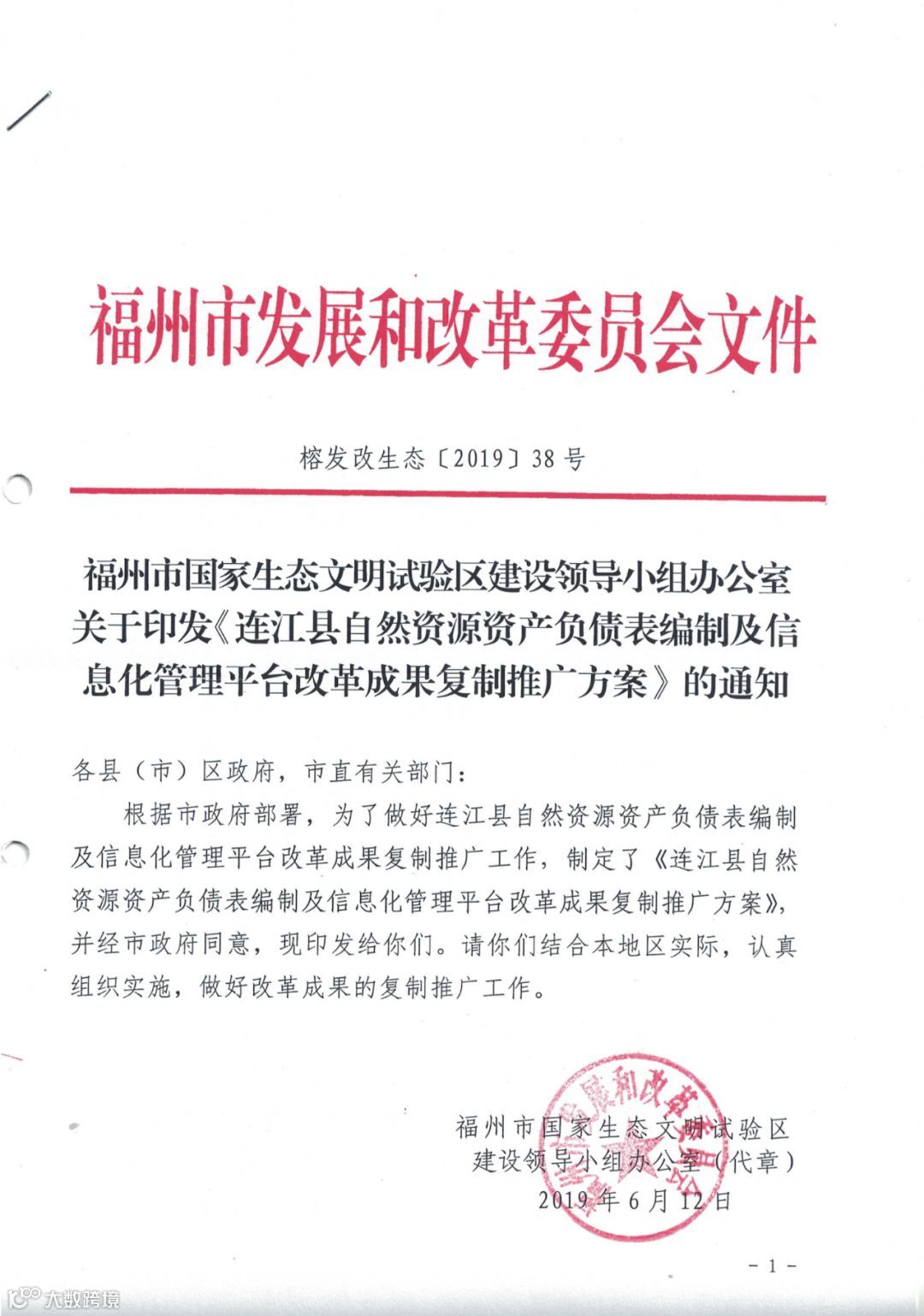 2019年6月12日,经福州市政府同意,福州市国家生态文明试验区建设领导小组办公室印发了《福州市国家生态文明试验区建设领导小组办公室关于印发<连江县自然资源资产负债表编制及信息化管理平台改革成果复制推广方案>的通知》(榕发改生态[2019]38号),要求福州市各县(市)区政府、市直有关部门结合本地区实际,认真组织实施,做好改革成果的复制推广工作。