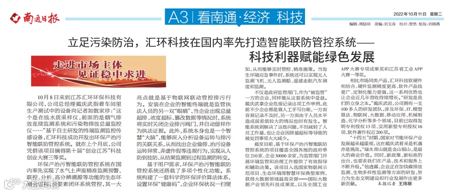 在采访过程中,戴庆武总经理向南通日报的记者详细介绍了环保产治污智能联防管控系统,这是公司立足污染防治,基于自主研发的终端监测监控传感设备而开发的,本系统在国内率先实现了水气土声废精准监测预警、联控、分析、高分辨溯源等功能的生态环境全过程、全要素闭环系统管控,其一大亮点就是基于物联网联动管控排污行为。安装在企业的智能终端就是监管执法人员的另一双“眼睛”,当企业出现总量超排、浓度超标、篡改数据等情况时,系统将实时关闭企业排污阀门,并自动留样作为执法证据。目前,本系统已覆盖全国各地的政府单位210家、企业30000余家,并入选国家物联网示范项目、生态环境部智慧环保典型案例,获得大数据领域最高荣誉——国际大数据产业领先科技成果奖,以及全国工业APP大赛专项成果奖和江苏省工业APP大赛一等奖。