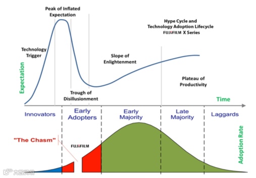 那该什么时候进呢?应该看这条曲线——来自《跨越鸿沟》这本书,它是人的社会集体心理的反映——技术驱动型产品都会经历这个曲线。