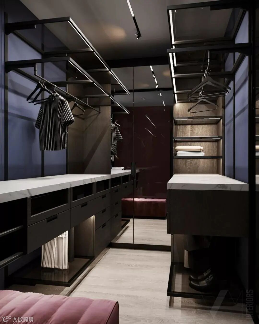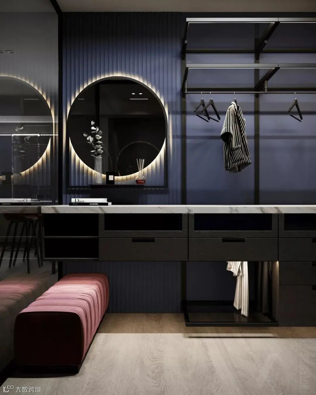 独立的更衣间做成了一个360°全透明的玻璃盒子,内壁设有蓝色的复古墙壁,与黑色质感交相呼应。