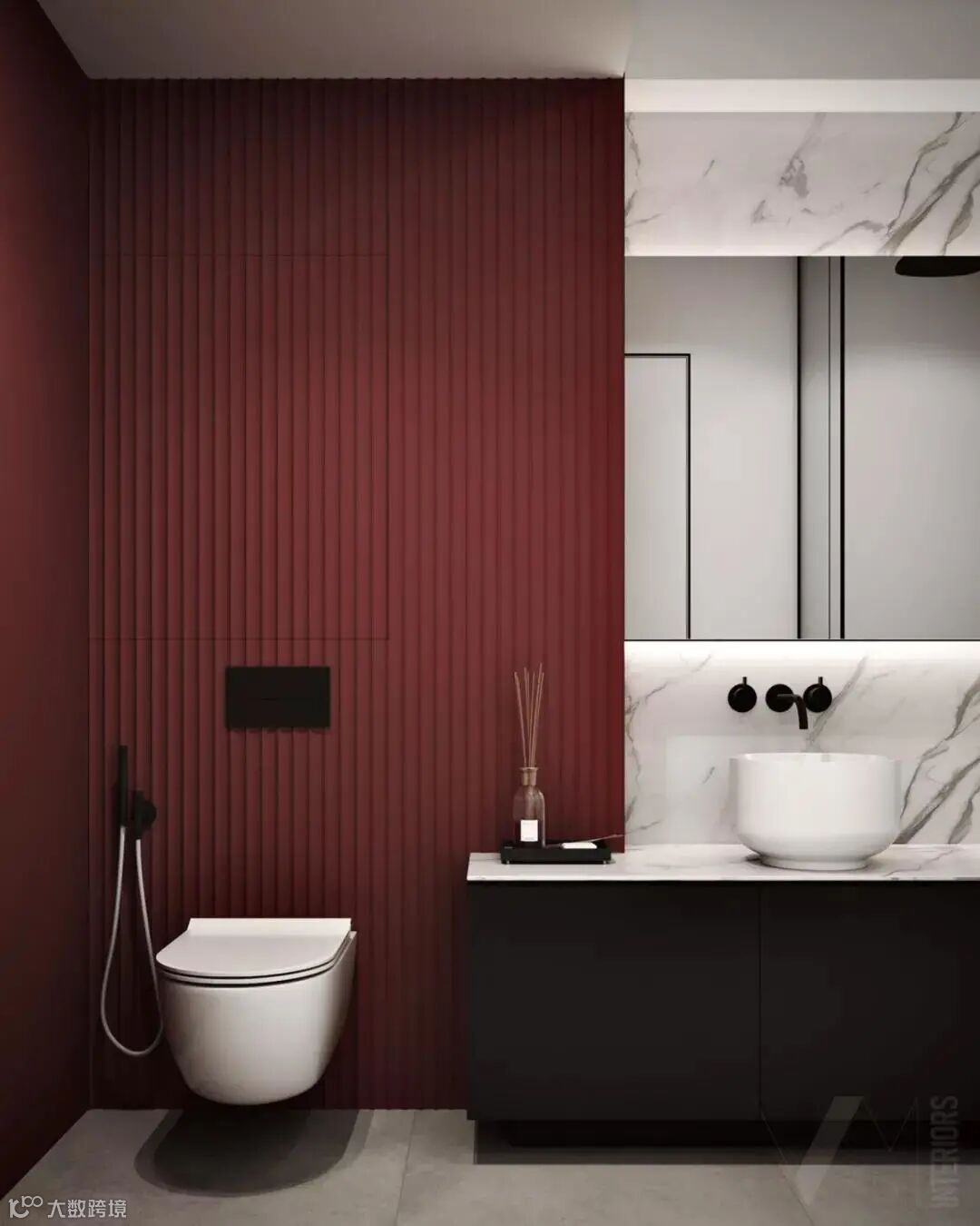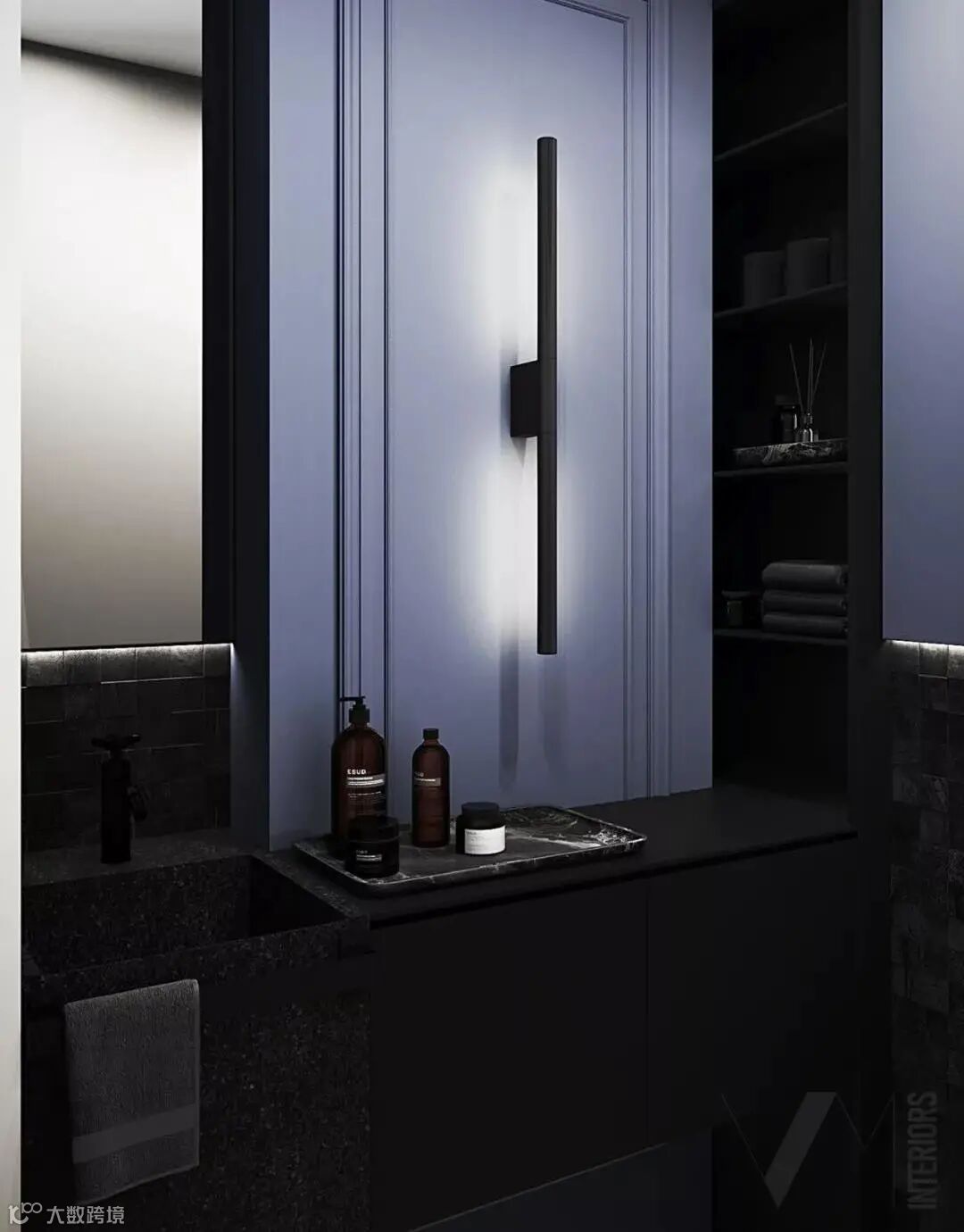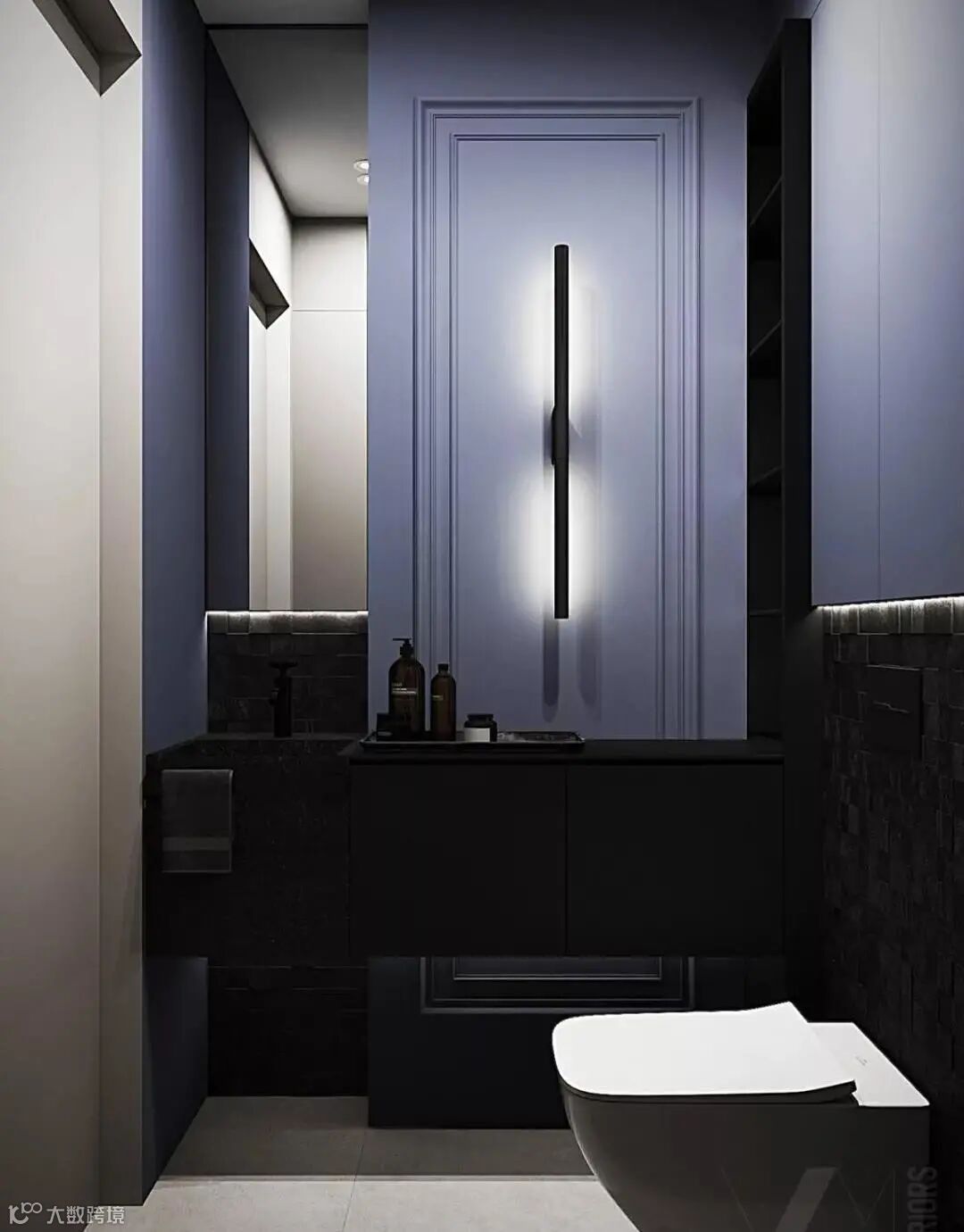 洗手间以蓝色和红色为主,优雅、前卫,在这之中夹杂着黑色的元素突显复古的浓郁调性,时尚之感扑面而来。