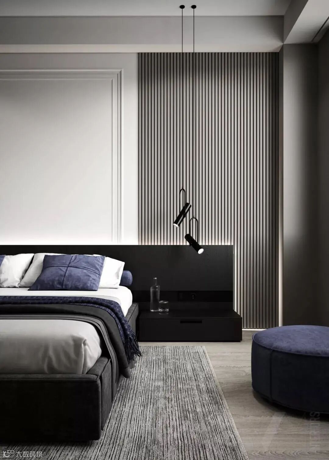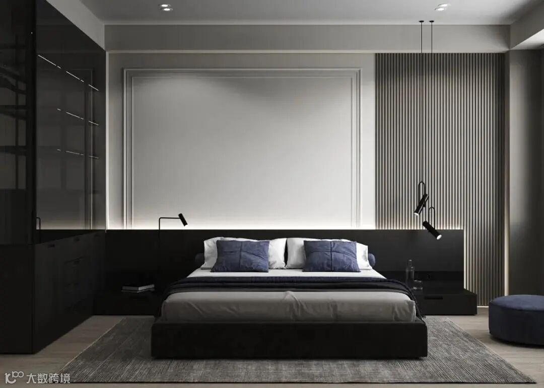卧室的设计通透、明亮,以黑白灰为主色调,极简的线条带来利落的感觉,灯光的运用也极为隐蔽细腻,让人感受到居家的惬意和华丽。