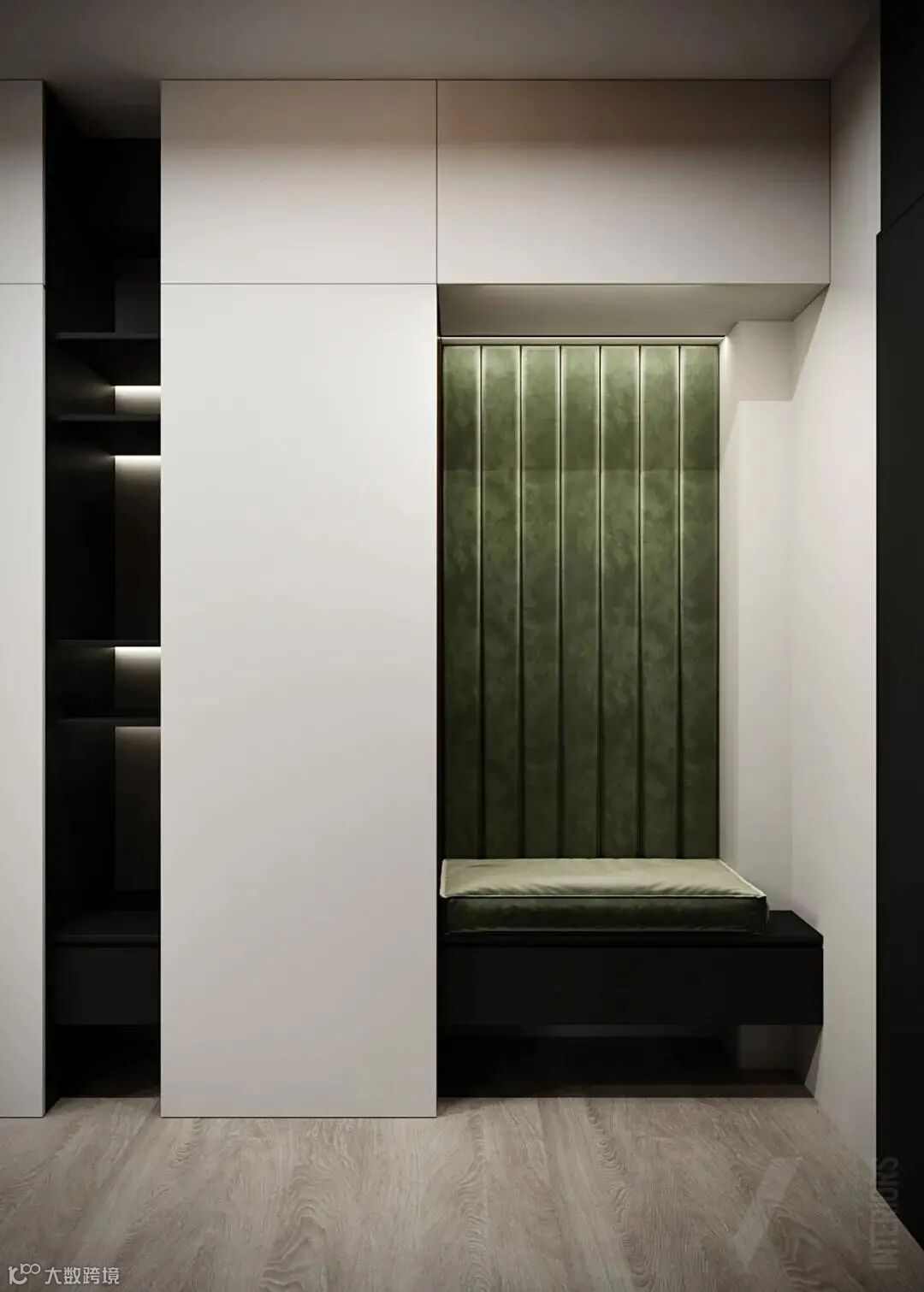玄关的设计韵味十足,现代感的线条辅以古着的红绿色彩,别有一番体验,让人在入户之初,就能感受到时尚的调性。