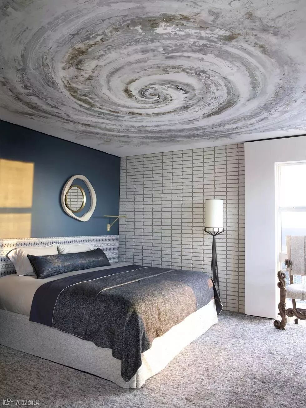 手绘螺旋图案壁画设计拓宽了天花板的视界,其清晰的螺旋纹理让人联想到银河系的巨大漩涡,犹如躺在太空中看着日月星辰。