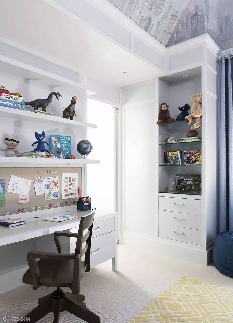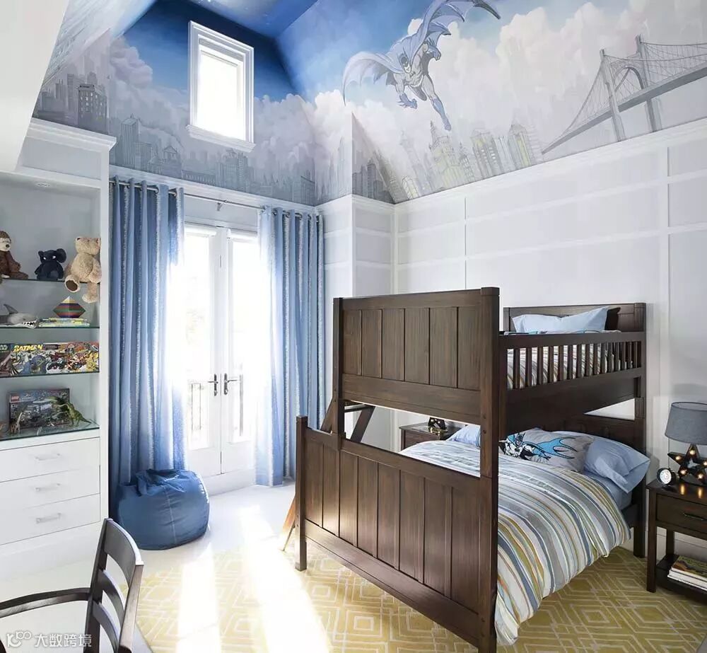 比起大人们的卧室,孩子的空间更需要一些想象力,不需要刻意追求深邃和意境,只要有一些简单而乐观的童趣。蝙蝠侠,怪兽…这孩子估计是漫威的忠实粉丝。