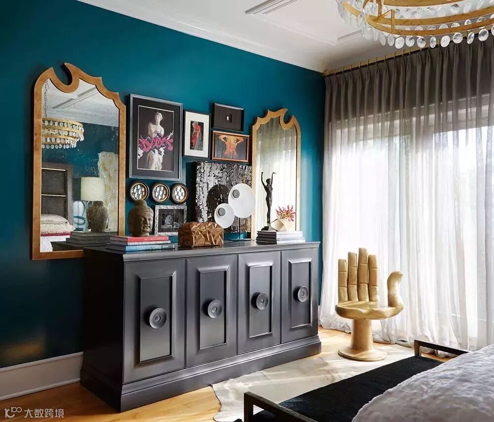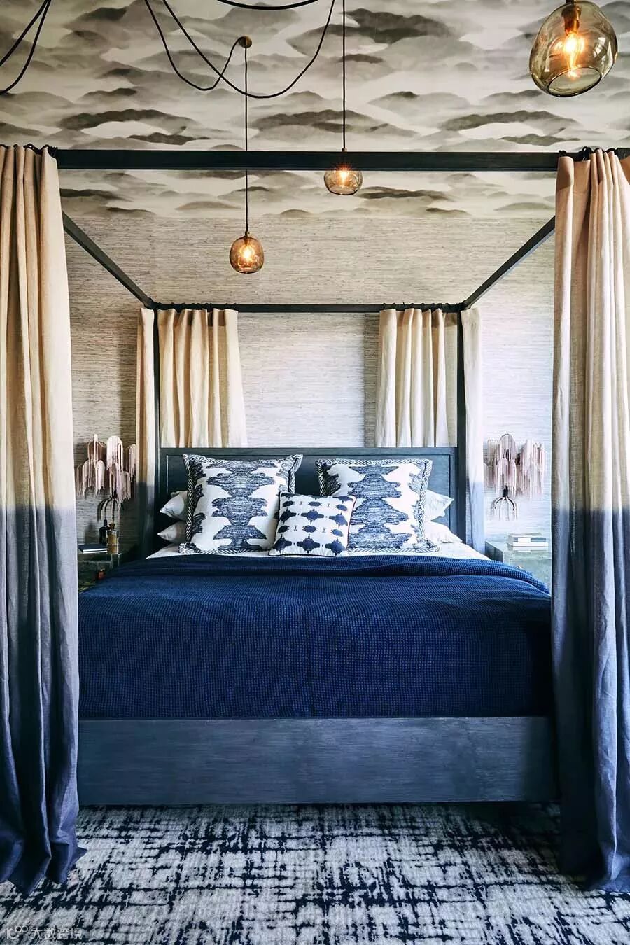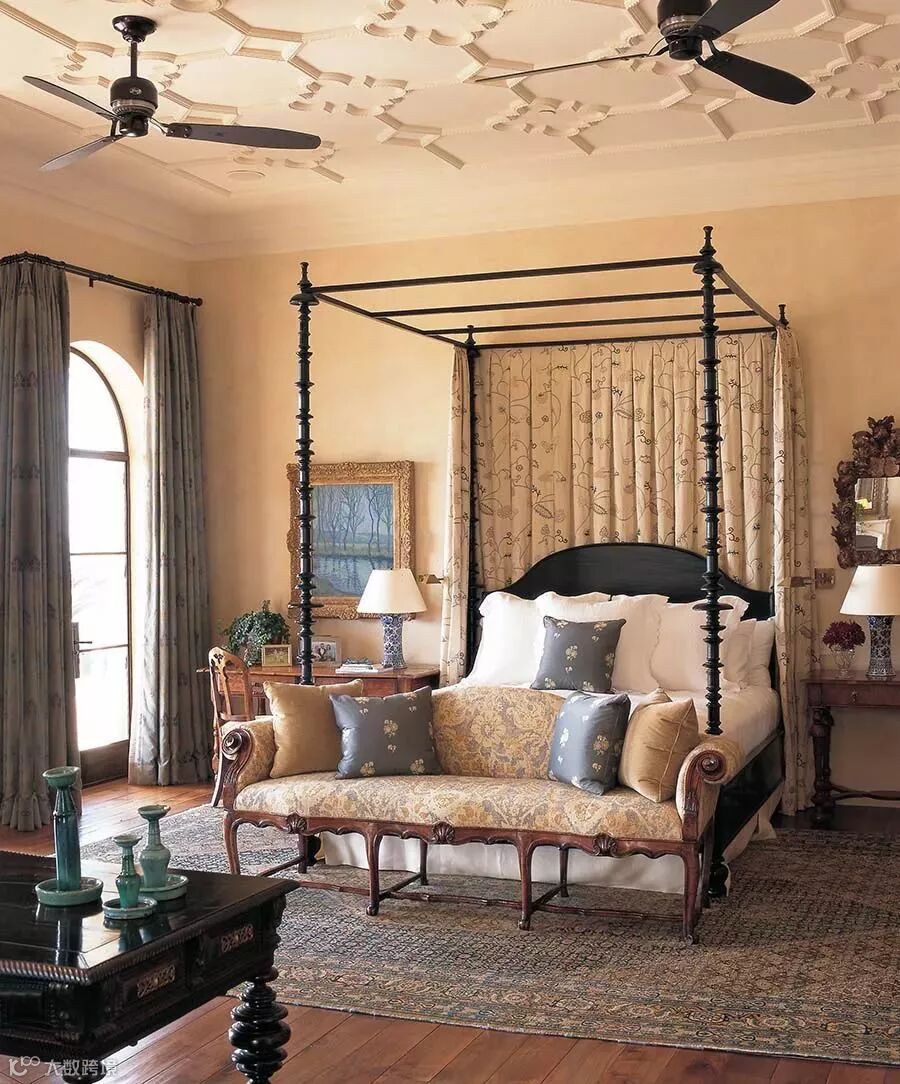 背景墙面使用浅蓝纯手工绘画壁纸,搭配白色的拱顶造型,有着教堂般的神圣感。鎏金吊灯,黑色的天蓬床,淡金色花纹窗帘,这些设计唤起了心中的虔诚。