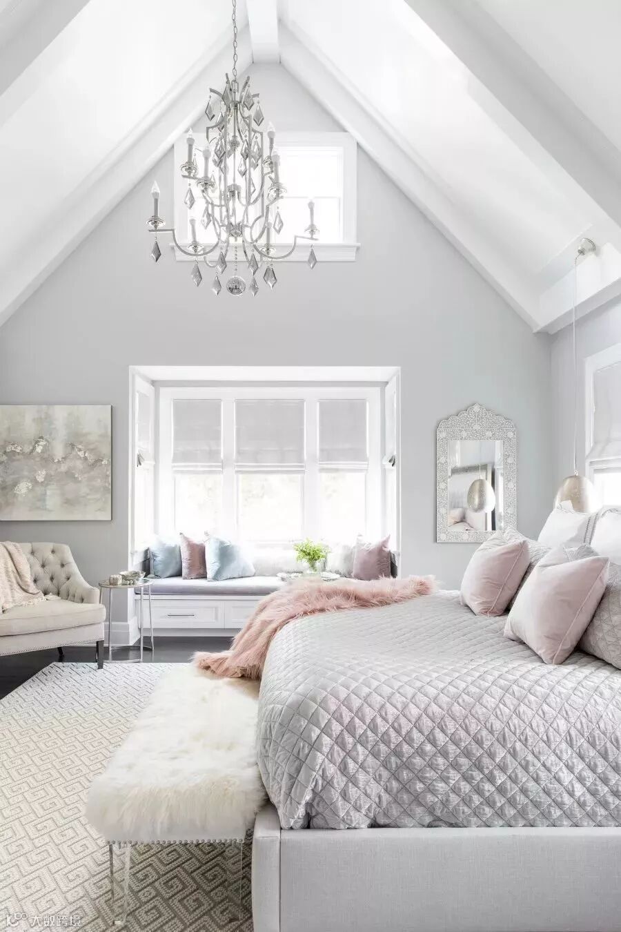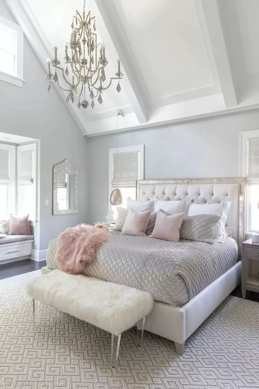 在这间配有琉璃水晶吊灯并以浅粉色点缀的卧室中,纯白色的拱顶支撑起了白雪公主的童话世界,仿佛连清透的阳光似乎也被滤成白色。