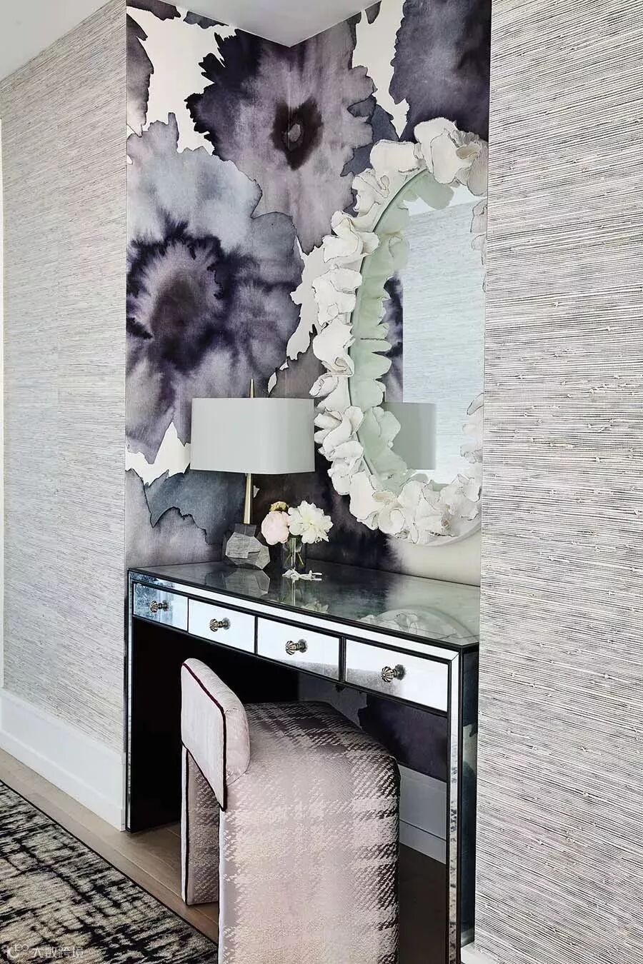 单色对于空间的延展有相当不错的作用,单看这面紫色第五面墙,搭配结晶花型吊灯,如层叠的翅膀的视感,让空间整体变得更梦幻轻盈。