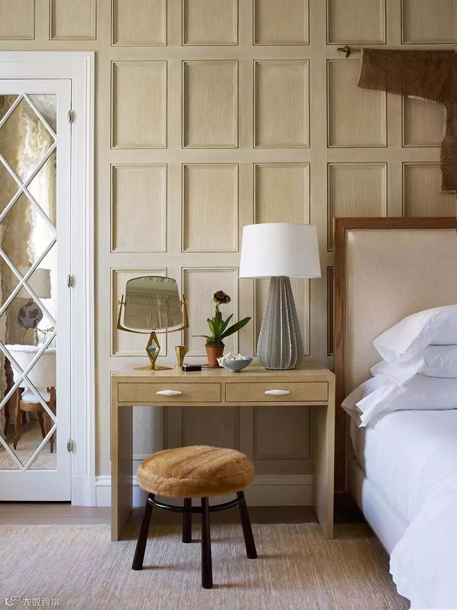 在色彩较为饱和的卧室,天花板用一些简单的石膏线,来增添一些立体感,立体感背后是视线的延伸,为其他元素制造了更多空间的错觉。