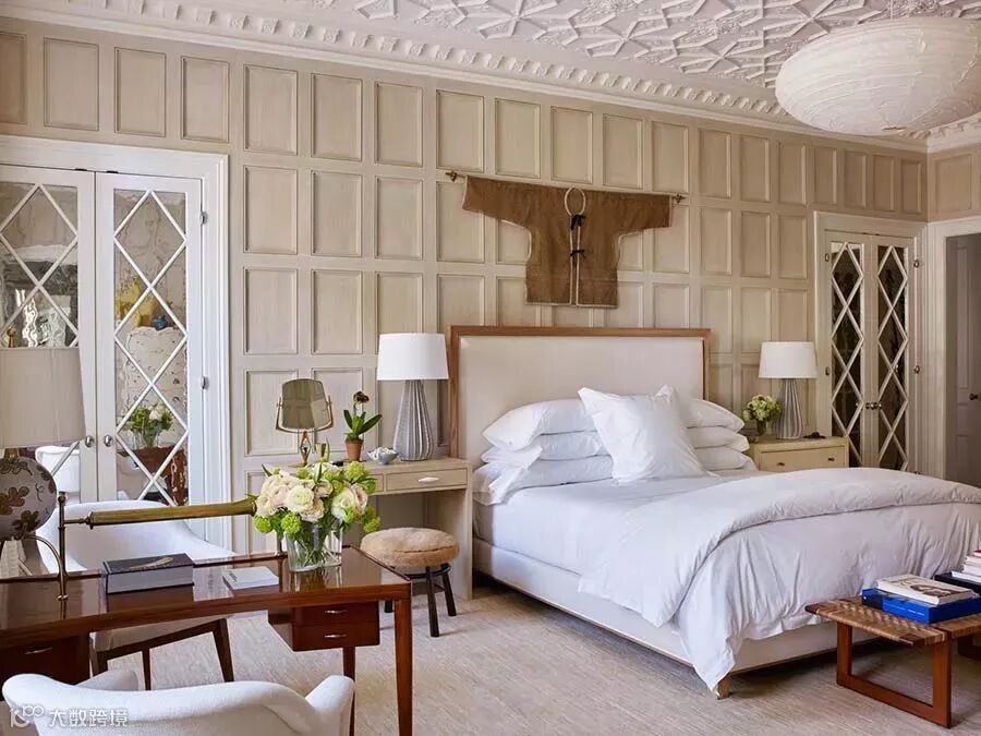石膏线雕刻是一个相对实惠的装修选择,在这间奶黄色调卧室中,原本因色泽而柔和恬淡的气息因讲究的墙壁和精雕细琢的天花板而更增添了一份独特的魅力。