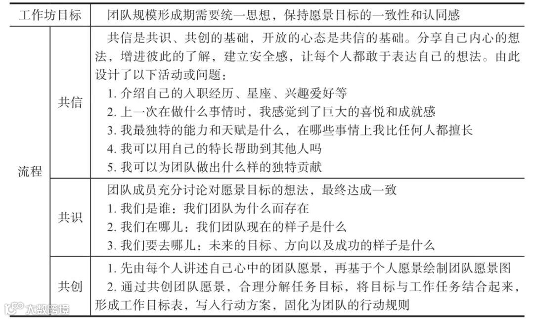 共启团队愿景的一个可操作的方法就是“团队愿景引导工作坊”。可以先结合当下现状,设计一份工作坊流程表。