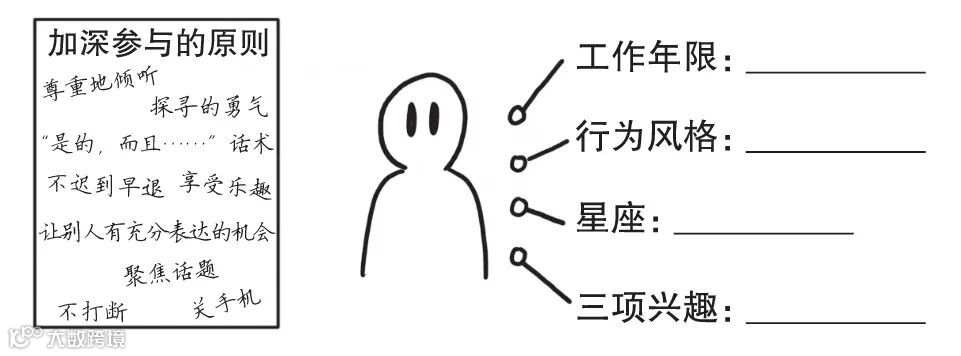 工作坊规则共识及成员介绍。在白板纸上跟大家一起制定工作坊的规则,提醒大家共同遵守。