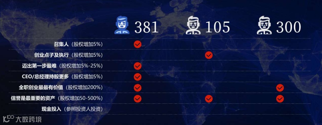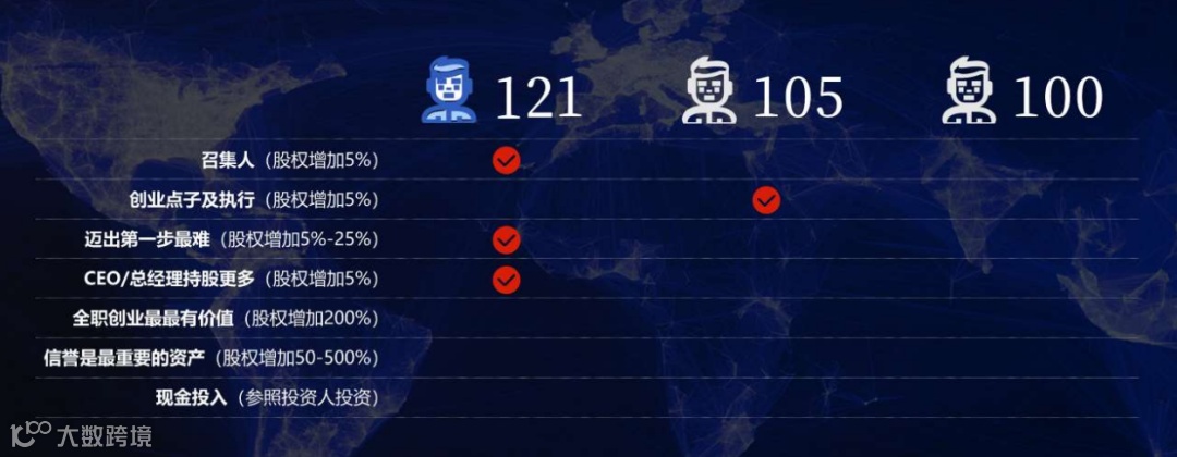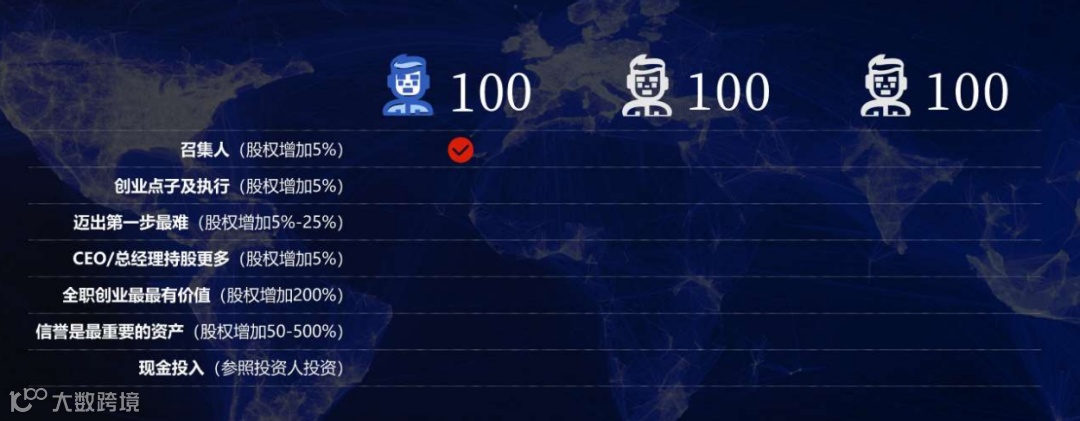 接着可以列一些条目,分别给予这些条目不同的权重,一段时间之后计算每个人的贡献,确定每个人的股权比例。