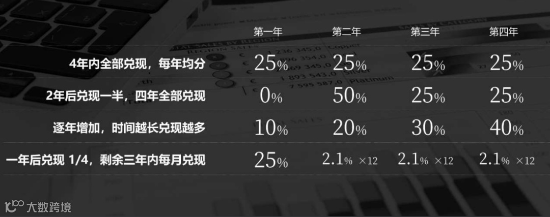 比如:第1年先不兑现,因为看不出能力和业绩,等到第2年一次性兑现50%,之后2年每年兑现25%。