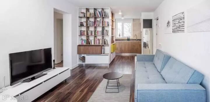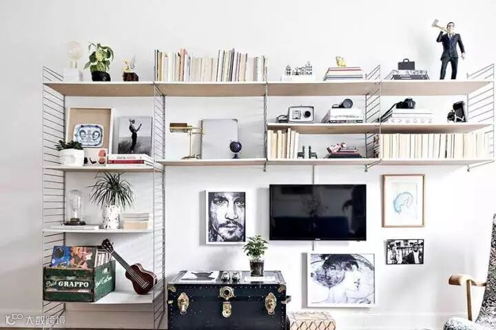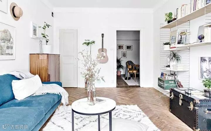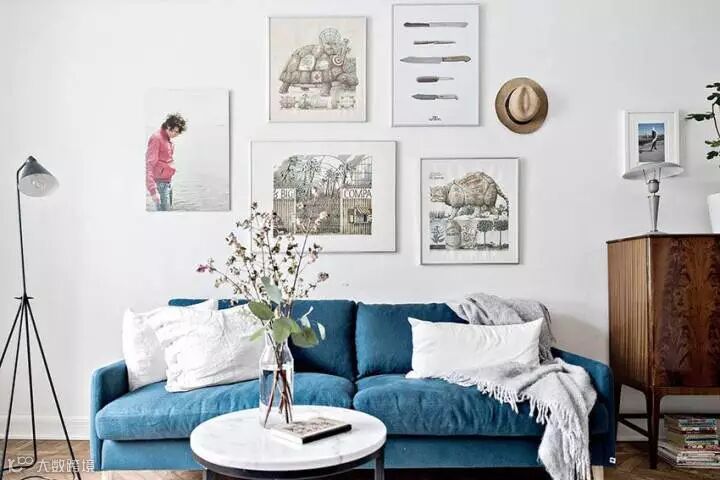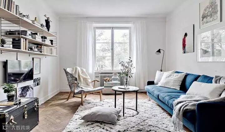 蓝白的配色给人一种清爽的感觉,蓝色本身就有减压和放松身心的效果,精致的挂画让白墙也显得非常有质感,客厅用金属架子打造了一个开放式的收纳区,下面摆放一个复古的箱子,即可以做为收纳用途,还能提升整个空间的格调。