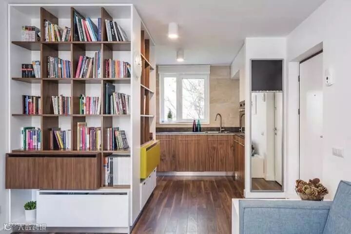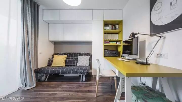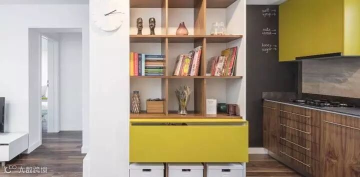 以白色为基底,添加了亮黄色为空间注入活力,风格非常的轻松,空间利用到位,靠窗处同时结合了储物与坐椅的功能,厨房隔间整合了书籍收纳的功能,一物两用的概念能够使空间利用最大化,还能保证视觉的宽阔感。