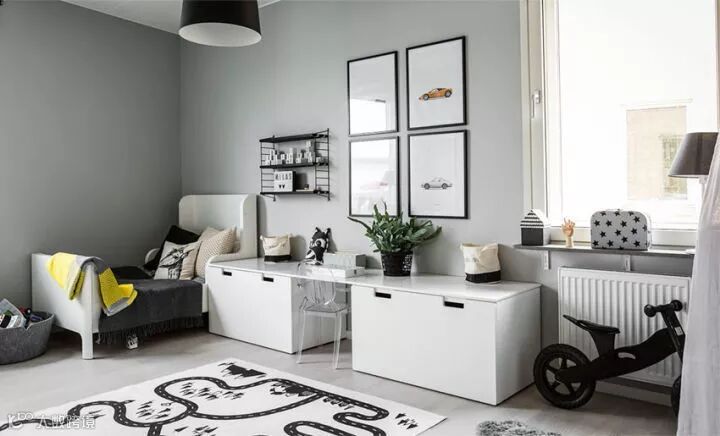 这种设计的初衷是让你在里面住30年也会不腻,利用了大面积灰色和白色,从封面到地板,甚至家具都采用了此色系,视觉感非常统一,有质感。挑选了一些亮色做为点缀,比如小的皮坐椅,增加了整个空间的温度,儿童房的设计也非常到位,简洁清爽,容易塑造和培养孩子干净整洁的习惯。