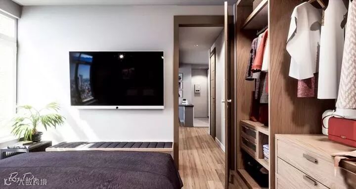 通过大量使用实木材质与浅灰色、白色搭配,从客厅到卧室采用同一色系,在公共空间很巧妙的利用了带有温暖感的粉嫩色调单品来调和冷淡感,收纳系统也设计得很棒,视觉感非常好。