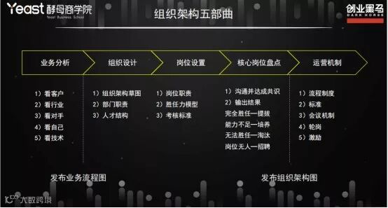 因此创业者一定要学会把自己的业务流程图画出来,围绕业务流程来搭建整个组织,根据自身的特点与需求,通过组织让自己变得更敏捷,而不是去照搬其他企业的组织框架。