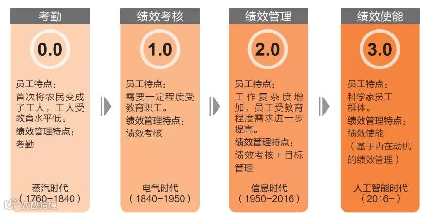 第零代叫考勤,以上下班打卡为主要标识。它是蒸汽时代的产物。蒸汽时代大致始于1760年到1840年这段时间,它首次将农民从田地赶到了工厂,把农民变成了工人,由于当时工人受教育程度普遍较低,工厂劳动中绝大多数又都是体力活,工作枯燥乏味,工人上班的动机仅仅是为了维持一份生计,谈不上工作热情。在这种情况下,工厂设置了大量的监工,负责监视工人到岗情况,以及劳作过程中是否有偷懒和磨洋工。所以,那时的绩效考核,就是单纯的考勤,看工人是否按时到岗,按实际到岗天数结算薪酬。
