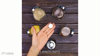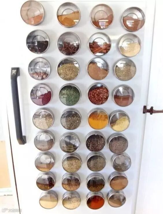 将装各种配料的食物瓶子分装,用粘胶在瓶盖粘上一块磁铁。然后一个一个吸上去,完成!