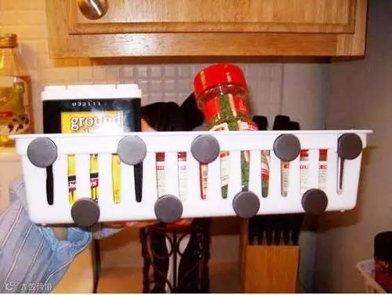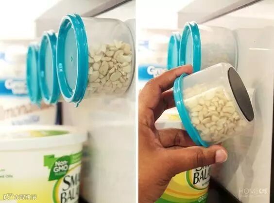 有些不是瓶装的东西怎么办呢,那就把磁铁贴在小篮框上!冰箱外多出一层收纳篮,别再说东西没地儿放啦!