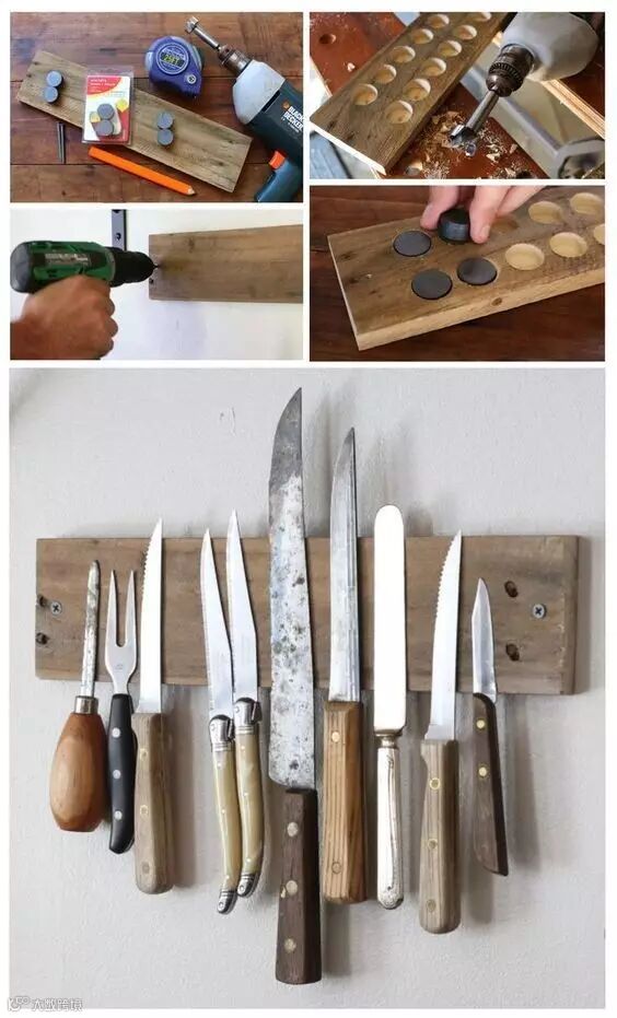 想要这样高大上的刀具收纳架,其实很简单!找一块木板,钻出几个孔。
