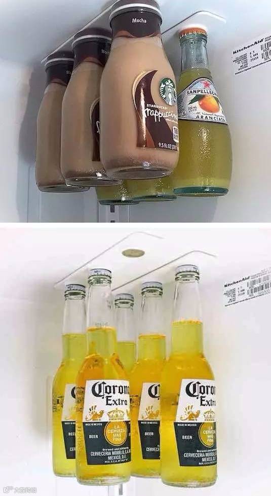 在冰箱的内部贴上一些瓶子,可利用空间瞬间大了好几倍,根本不用再想着换大冰箱!