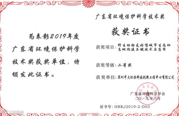 广东省环境科学学会为推动广东省生态环境科学技术发展,鼓励科技创新,开展了2019年度广东省环境保护科学技术奖项目征集评选及2019年生态环境青年科技奖评选工作。我公司参与承担的“野生动物友好型城市生态栖息地构建关键技术与应用项目”在此次评选中荣获二等奖。该项目是践行生态文明理念,促进广东省特色生态产品开发,推进珠三角国家级森林城市群建设,完善粤港澳大湾区生态安全网络格局,提升整体生态价值的重要支撑内容。此次获奖也是广东省环境科学学会对我公司年两年来在生态环境科技工作中所做出的工作给予肯定。