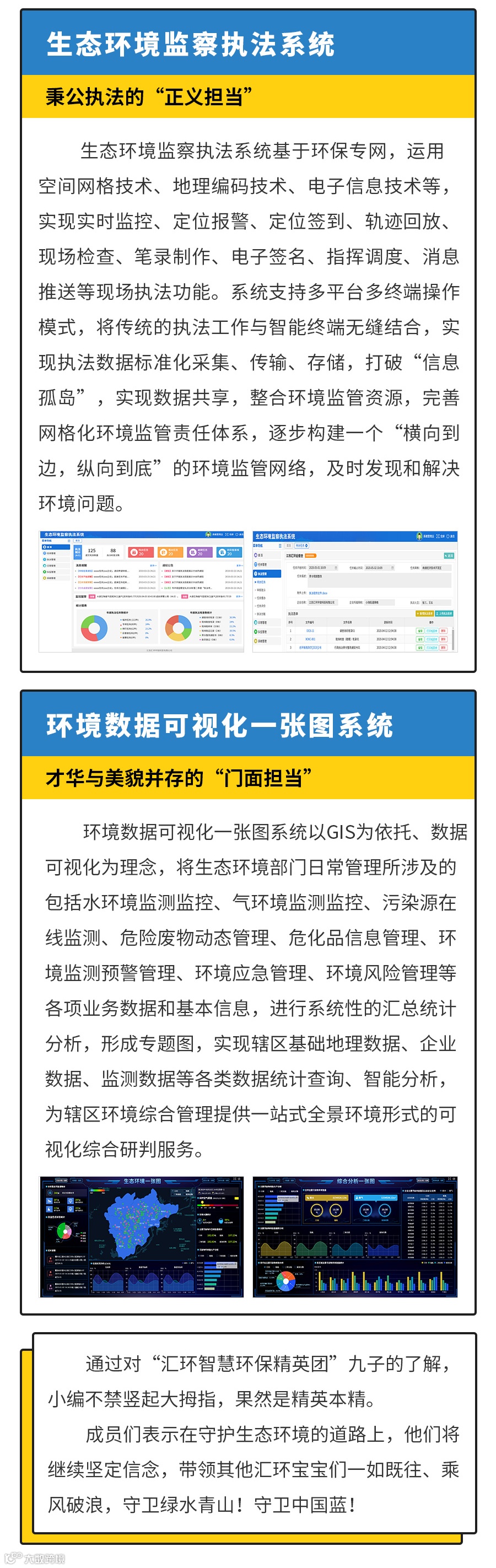 导读:经过上周激烈的角逐,共有9位宝宝从30位候选者中脱颖而出,组成“汇环智慧环保精英团”,团员们各有所长,分别担任团队中的重要职位,涉及生态环境监测监管领域的方方面面。