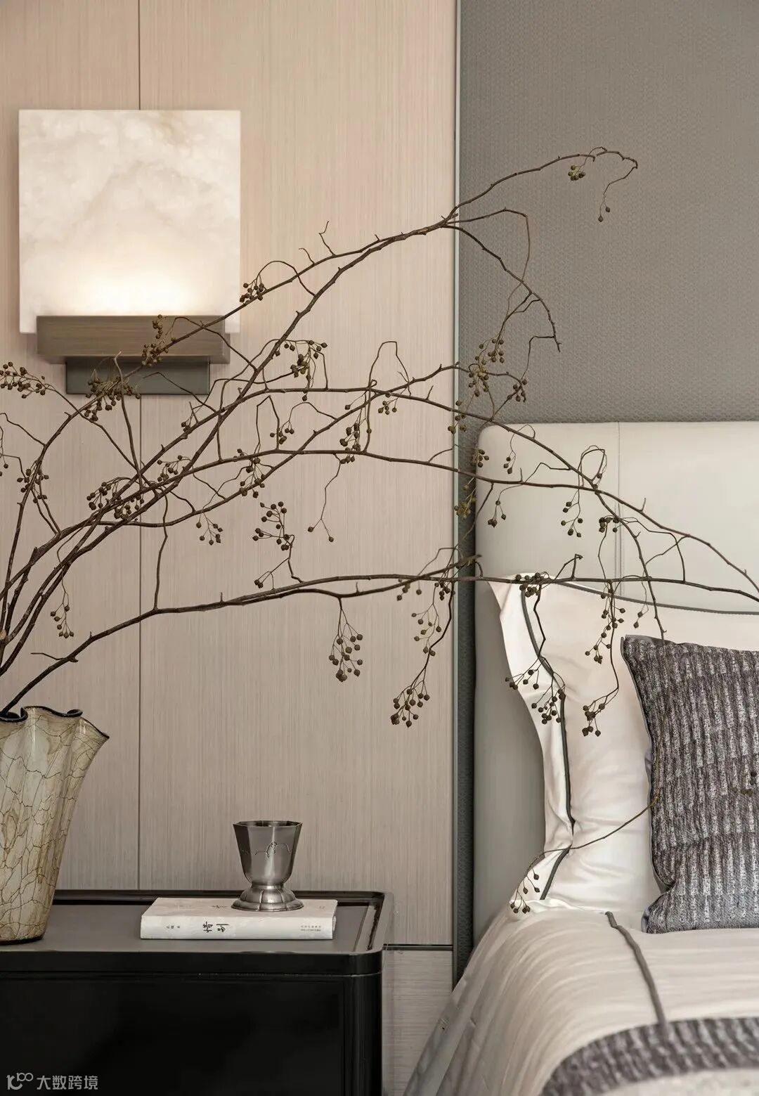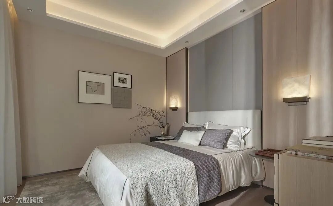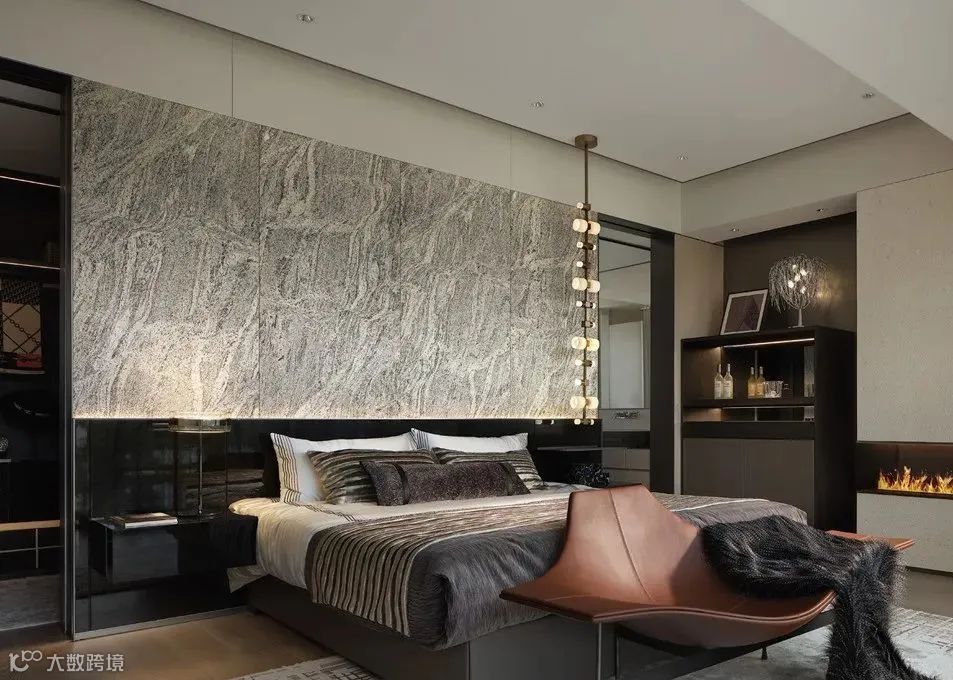 二层设计为休憩空间,主卧的设计以舒适为要义,奢适的尺度包容了主卧与独立的衣帽间和卫浴,深色沉稳适于沉淀,材料也以自然舒展为主。