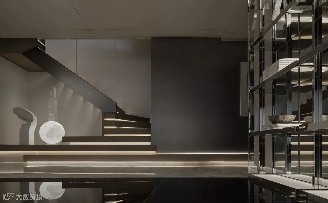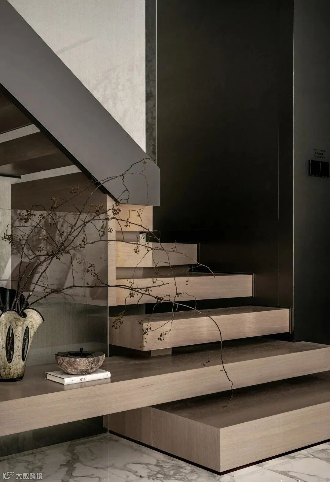 楼梯在空间中往往承担着开合转折的作用,木质的阶梯自有序列,材质的碰撞使楼梯本身也成为了颇具抽象美感的装饰雕塑。